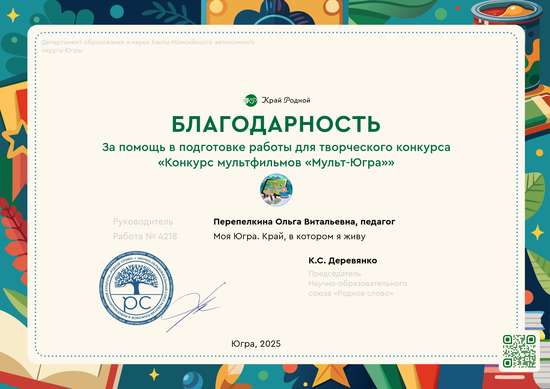 Творческая работа непосредственно связана с конкурсом и номинацией, так как выполнялась для участия в конкурсе "Мульт-Югра", и в ней кратко освещаются темы выбранной номинации. Дети создавали героев, склеивали, раскрашивали, выполняли декорации, передвигали героев при съемке, фотографировали. Педагог оказывал помощь на протяжении выполнения творческой работы (идеи, оформление, контроль съемки, монтаж). Родители оказывали техническую помощь, предлагали идеи.