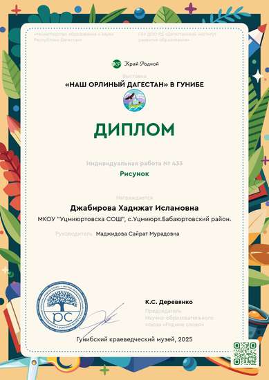 I место на конкурсе Наш орлиный ДагестанУчастник выставки «Наш орлиный Дагестан» в ГунибеУчастник выставки «Традиции Дагестана» в Махачкале