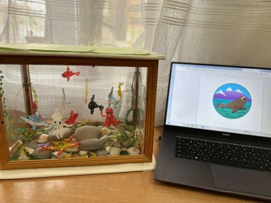 В моей работе я описала подводный мир моря: его обитателей и растительность. Фигурки животных из бисера сделаны детьми под руководством педагога. Аквариум собрал педагог из фоторамок с помощью термоклея. Композицию мы создавали вместе. Мы выбрали эту тему, потому что подводный мир завораживает. Особенно приятно наблюдать за ним через стекло. Ребенок вспомнил поездку в океанариум на каникулах. Это вдохновило его создать свой аквариум.
