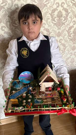 Я, Ханмагомедов Магомедхабиб ,живу в такой прекрасной республике Дагестан, где можно увидеть разнообразие всех природных зон от горных вершин до моря и до песчаных бархан . Все разнообразие нашей природы не смог показать в работе, но малую часть нашей природы я показал. Я очень люблю природу и все связонное с ней, попытался изобразить кусочек жизни горца. В создании этой работы мне помогли моя сестра и мама. Я лепил барашек ,овощи, клеил горячим клеем крышу дома из деревянных мороженных палочек,клеил траву.