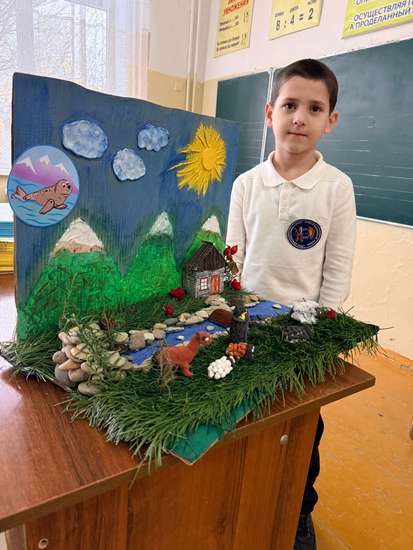 Наша работа создана для номинации «Пойми живой язык природы» и показывает, как природа живёт и взаимодействует вокруг нас. Ребёнок сам лепил животных из пластилина, оформлял траву, ручей и раскладывал камушки, создавая целый природный уголок. Взрослые помогали только с креплением отдельных деталей. Эта композиция отражает идею о том, что природа «говорит» с нами через свои формы и краски, и важно уметь замечать её живой язык.