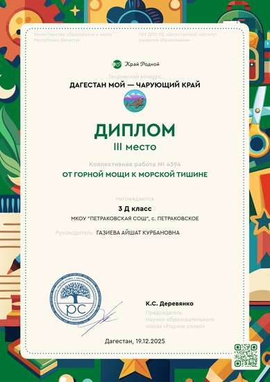 Наша коллективная работа — это погружение в удивительный мир воды, омывающей Дагестан и хранящей его древнюю красоту. Мы стремились соединить в одном произведении ГОРНУЮ МОЩЬ, силу морской волны и таинственный подводный мир, в котором оживают легенды нашего края. Каждый элемент композиции — словно капля, отражающая душу Дагестана: прозрачную, глубокую и невероятно живую. Мы создали не просто поделку, а путешествие «на воде и под водой» — туда, где время замедляет ход, где свет играет на поверхности, а под толщею воды раскрывается целая вселенная красок и форм. Эта работа рождена усилиями команды единомышленников, вдохновлённых гармонией природы и желанием показать, как многообразно может выглядеть наш родной край, если взглянуть на него сквозь призму волн и отражений. В нашем творении переплетаются реальность и воображение, дыхание глубин и энергия движения. Это — история о воде как о сердце Дагестана: сильной, чистой, мудрой и бережно хранящей прошлое, чтобы отражать настоящее. Мы надеемся, что наш труд подарит возможность увидеть знакомые места по-новому — спокойные, глубокие и бесконечно вдохновляющие.