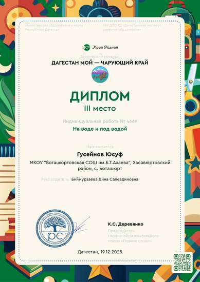 Готовая работаВ проекте показали разнообразие животного мира , который находится на грани исчезновения, сохранившийся только в Дагестане. Это баклан и тюлений. Наша задача сохранить и размножить красоту и разнообразие подводного и надводного мира Каспия для будущих поколений.