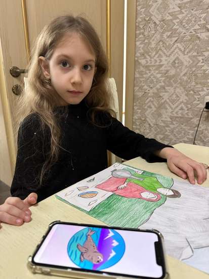 Это мой рисунок. Я нарисовала го́рный пейзаж Дагестана: высокие скалистые горы, голубое небо и орла, который летит высоко над ними. Мне захотелось показать, какая у нас красивая природа — сильная и свободная, как орёл. На переднем плане я нарисовала маму и меня, потому что мы часто ездим в горы и я люблю эти моменты. Мне хотелось показать, что в горах мы чувствуем себя счастливыми, спокойно и близко друг к другу. Я старалась передать красоту гор, их величие и то, как они соединяют нас с природой. Этот рисунок для меня — о любви к семье и к родным местам, о том, что природа и близкие делают меня сильной и счастливой.
