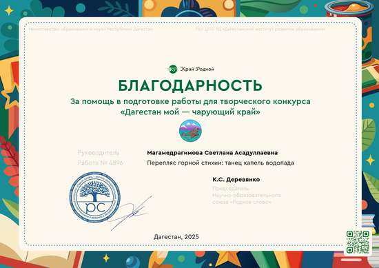Работа выполняется в рамках номинации "Пойми живой язык природы" конкурса "Край мой родной-Дагестан".Под руководством педагога юный мастер воплощает образы местной природы, используя искусственные материалы и проявляя фантазию.