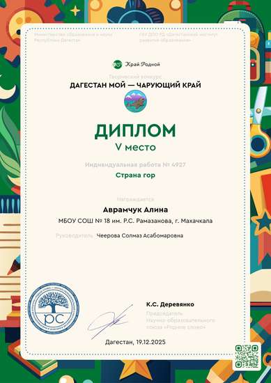 Я всегда с большой радостью принимаю участие в разных конкурсах. Но этот конкурс, связанный с родным краем, особенно важен для меня. Я очень люблю мой родной край. И эту любовь мне хочется передать через свой рисунок. Каждый воспевает эту красоту по своему, и мне хочется через свою картину. Дагестан-страна гор, и у нас самые красивые, живописные горы, не передать эту красоту невозможно. Я горжусь красотой и живописностью нашего Дагестана. Хочу выразить благодарность нашей учительнице по ИЗО, Солмаз Асабомаровне, которая умеет правильно направить нас и учить творчески подходить к своей работе.
