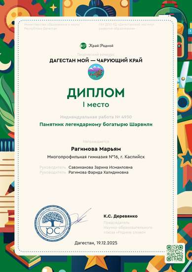 I место на конкурсе Дагестан мой — чарующий крайУчастник выставки «Дагестан мой — чарующий край» в Буйнакске