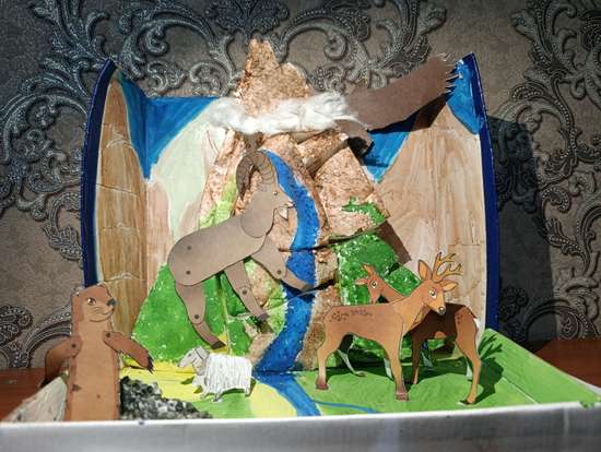 Ученик 3 "г" класса Рахметов Магомед выполнил эту работу с целью передать очарование родного родного края через творческие работы: поделки. Он этим хотел показать мир животных и растений, обитающих на разной высоте в горных районах, а также раскрыть секреты того, что находится внутри гор: минералов, пещер и их обитателей. Все мы горы любим и часто в них ходим.
