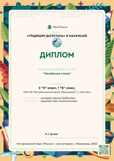 Ногайская степь простиралась перед взором, бескрайняя и молчаливая, словно спящий великан. Эта земля издревле принадлежала кочевникам, вольным всадникам. Вдали, словно грибы после дождя, вырастали юрты – мобильные дома. Медленно, величественно, по степи брели верблюды. Женщины-ногайки играют на домбре, потому что домбра – это неотъемлемая часть ногайской культуры. Этапы работы: 1. Проектирование: Разработка эскиза макета с указанием масштаба, расположения основных элементов и используемых материалов. 2. Изготовление основы: Создание основы макета из ДСП. 3. Формирование рельефа: Моделирование рельефа с использованием ткани. 4. Изготовление фигурок животных и строений: Создание фигурок животных, юрт, гор, жителей степи, ковров и т.д. 5. Компоновка: Размещение всех элементов на макете. 6. Презентация: Подготовка описания макета.