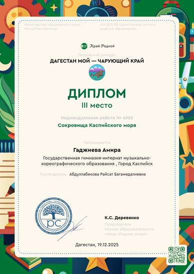 Здравствуйте! Меня зовут Амира, мне 9 лет, и я вместе с педагогом-организатором Абдуллабековой Райсат Багамедалиевной сделала поделку про обитателей Каспийского моря. Мы использовали мои рисунки и настоящие ракушки, которые принесли с моря — они такие гладкие и блестят, как сокровища! Каспийское море — самое большое озеро и в нём живут удивительные существа! Я нарисовала осетра — он очень важный и древний, и приносит полезную чёрную икру. Сейчас его берегут, потому что его почти не осталось. Ещё я нарисовала каспийского тюленя — это единственный пресноводный тюлень в мире! Он такой милый, с большими глазами и любит плавать в одиночку. А из ракушек Дрейссена мы сделали коралловый уголок — там прячутся бычки и маленькие креветки. Мне было очень интересно учиться о жизни под водой, и теперь я хочу, чтобы Каспийское море всегда оставалось чистым и полным жизни. Ведь если мы будем беречь его, то эти удивительные животные никогда не исчезнут!
