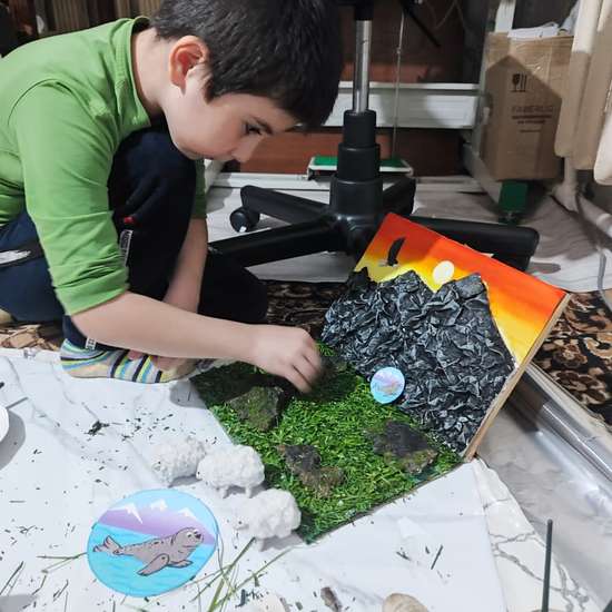 Материалы: Картон, белая бумага, фольга, краски, пластилин, проволока, шерсть, камни, трава, клей ПВА и горячий клей.