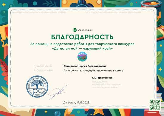 «Аул-крепость: традиции, высеченные в камне» Работа раскрывает номинацию через образ горного аула,где каждый предмет — материальная «былина». Сушеная тыква, орехи, припасы на навесе говорят о мудрости, запасливости и единстве с землей. Дети лепили тыкву, создавали фактуру стен крупой, красили, декорировали навес. Взрослые обеспечили каркас из картона и палочек, прочность конструкции и знания об архитектуре. Это совместное строительство мира традиций.