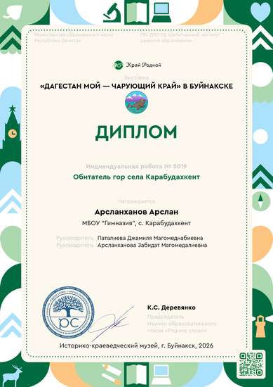 Наш конкурс "Дагестан мой — чарующий край" посвящён красоте и уникальности горных вершин нашего родного края. В номинации "Тайны горных вершин" мы выбрали тему разнообразия жизни, которая меняется с высотой: от горных лугов у подножия до суровых скал на вершинах. Особое место в нашем исследовании занимает Беркут — величественный орёл, символ силы и свободы. Этот гордый хищник обитает именно в горах вокруг села Карабудахкент, где его можно встретить на отвесных скалах, высоко над долинами. Беркут мастерски охотится на грызунов — мышей, сурков и других жителей гор, играя важную роль в экосистеме. Его острое зрение и мощные крылья позволяют королю неба господствовать в горах. Наблюдая за беркутом, мы видим, как прекрасно природа адаптируется к сложным условиям горного рельефа и как животные умеют использовать каждую высоту для жизни и защиты потомства. В нашей работе мы хотим показать, что берегите природу, уважайте легенды и традиции, ведь каждый орёл, каждый камень — часть неповторимой души Карабудахкента и всего Дагестана.
