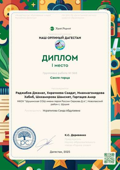 Ученики 2 го класса принимают участие в конкурсе «Ты мой очаг, ты моя колыбель». Они совместно с родителями постаралась показать саклю горца, с очагом и внутренним убранством. Они также смастерили стол с национальными дагестанским блюдами и хозяев сакли, которые с нетерпением ждут гостей. Вашему вниманию представляем проект «Сакля Горца» с очагом и внутренним убранством. Проект отображает жизнь и быт горцев Дагестана : встреча гостей, уход за детьми, ведение хозяйства , оформление комнат. К выполнению проекта обучающиеся 2 класса под руководством Исрапиловой Саиды взялись с большим желанием и радостью, потому что они воплощали собственную жизнь .Каждая деталь, над которой дети работали, несла информацию о народах заселяющих горную часть Дагестана, об их жизни и быте. Дети познакомились с блюдами, одеждой, бытом разных наций Дагестана. Первый этап подготовки включал ознакомление с проектом, дальше шла кропотливая работа вырезания, клейки и шитья деталей проекта. Но самое важное, что поняли дети для себя при подготовке данного проекта, что в Дагестане проживают гостеприимные, трудолюбивые и дружные народы.
