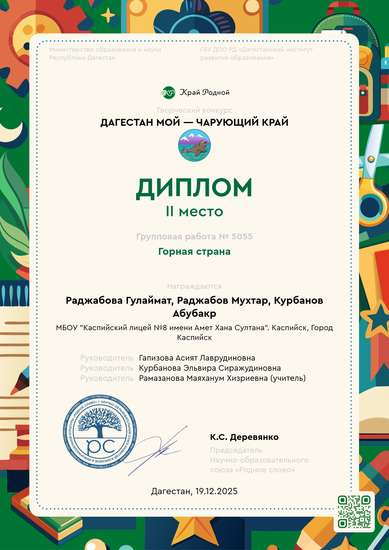 Руководители:Гапизова Асият Лаврудиновна, Курбанова Эльвира Сиражудиновна, Рамазанова Маяханум Хизриевна (учитель)