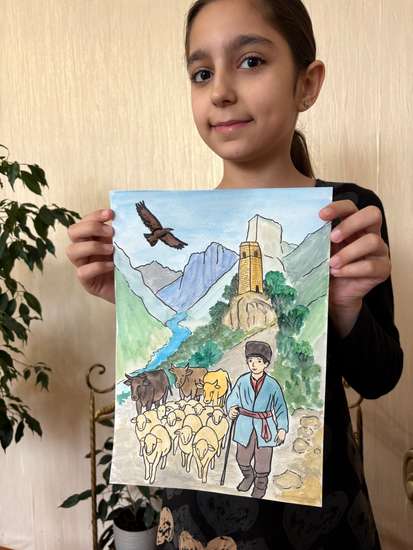 На рисунке изображен мальчик - пастух, который является главным героем известной Дагестанской (лезгинской) легенды «Каменный мальчик». Эта сказка является одной из любимых у Марьям, поэтому выбор пал на нее. Помощь взрослых потребовалась только на начальном этапе, чтоб подкорректировать набросок. Красками девочка рисует уже несколько лет, поэтому выбрала их для закрашивания своего рисунка.