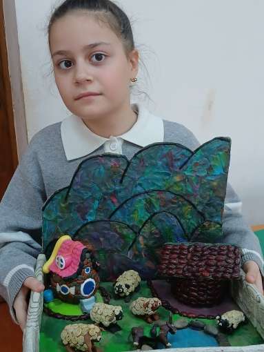 Поделка представляет собой мини ферму, сделанную вручную, из пластилина и природных камней. Это детский творческий проект. Фигуры животных (овцы, ослик) сделаны из пластилина, колодец был сделан из картона , пластилина и фасоли. В этой использована ярок выраженные горы на переднем плане трава и водоем. При создании водоема использовались природные камешки.