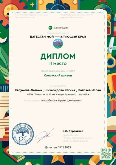 Мы ученики 2 "А" Гимназии №12 имени Анвара Аджиева города Каспийск, решили создать поделку , посвященную Сулакскому каньону. Сулакский каньон в Дагестане — один из самых глубоких каньонов мира, глубина до 1920 м, длина 53 км, он глубже американского Гранд-Каньона; это главная природная достопримечательность Дагестана с бирюзовой рекой Сулак, живописными видами со смотровых площадок (в районе поселка Дубки) и возможностью катания на катере из села Зубутли, куда можно добраться из Махачкалы.