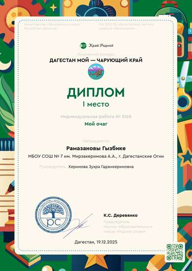 Мой родной край – это солнечный многонациональный Дагестан. Это мой самый родной и милый сердцу уголок, моя любовь, моя душа. Страна гор, которая находится на юге России и один из самых горных регионов. Природа моего края необычайно красива и разнообразна. Летом я побывала в этих местах и была приятно удивлена первозданной красотой этих мест.