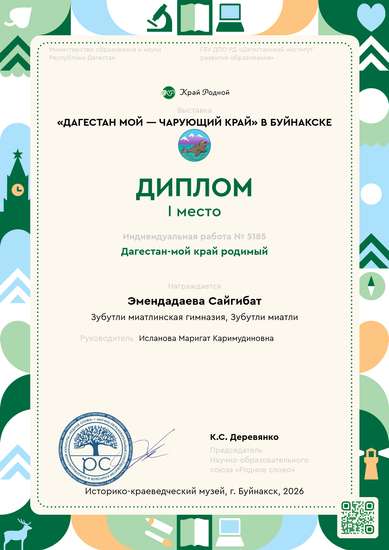 I место на конкурсе Дагестан мой — чарующий крайI место на выставке «Дагестан мой — чарующий край» в Буйнакске