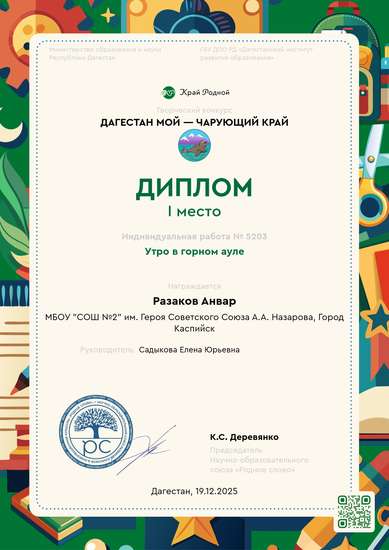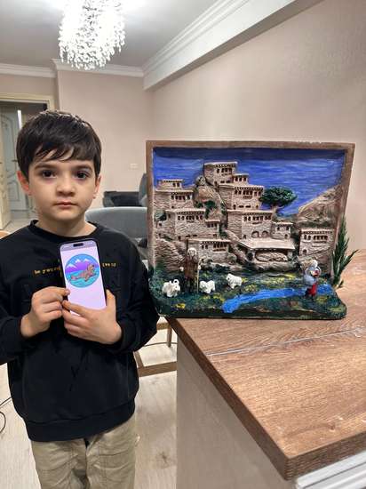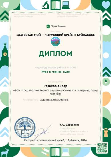 Наша работа называется "Утро в горном ауле" и поэтому мы старались изобразить природные богатства нашего края: величественные горы, реки, показать, чем занимались люди в горном крае, как они жили. Нам интересна эта тема тем, что мы показали красоту родного уголка, близкого сердцу кусочка малой родины. Анвар при помощи гипса и различных форм сделал дома, а потом собрал их так, как в реальной жизни. После он их раскрасил акриловыми красками. Делее из бумаги, клея ПВА, фольги и проволоки изобразили фигурки юноши, девушки и барашек. Раскрасил фигурки и приклеил их на основание работы.