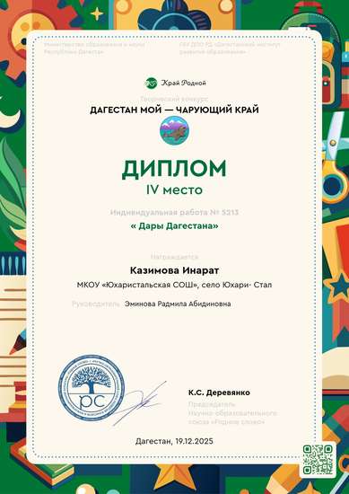 Я решила назвать свою работу «Дары Дагестана». В садах Дагестана созревают сочные, ароматные фрукты. Здесь выращивают самые сладкие персики с бархатистой кожицей, абрикосы, груши, яблоки. Овощной мир Дагестана не менее разнообразен. Плоды дагестанской земли стали настоящим брендом региона. Они покоряют сердца туристов и жителей других регионов своим неповторимым вкусом и качеством. Каждый сезон дагестанские рынки наполняются свежими дарами природы, радуя покупателей разнообразием. У нас есть магазин и в нем всегда свежие овощи и фрукты. Папа всегда их привозит на своей машине. Я очень рада, что живу в Дагестане. Дагестан – удивительный край, где природа щедро одарила землю своими богатствами.