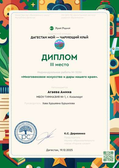 Выбранную нами номинацию считаю самой интересной, увлекательной, загадочной. В рисунке объеденены и красота дагестанской природы, и мастерство дагестанских умелиц- ковровщиц, и сладкие плоды, как символ богатства и плодородия нашего ЮжДага. В самых разных концах света встречаются упоминания о чудесных работах дагестанских ковровщиц. Еще Геродот Страбон, Плиний Старший писали о ковровых изделиях Кавказа и в частности Дагестана В самых разных концах света встречаются упоминания о чудесных работах дагестанских ковровщиц. Еще Геродот Страбон, Плиний Старший писали о ковровых изделиях Кавказа и в частности Дагестана. Помимо практических целей, ковер также привносил эстетику в монохромные жилища горцев. Многие орнаменты различных ковров, сотканных предками предков, предстоит еще расшифровывать, но даже и те данные, которыми располагают сегодня исследователи, дают возможность говорить, что в коврах наши предшественники передавали определенную информацию, орнаменты ковров хранят в себе расшифровку к многовековым былинам и легендам. Работа на всех этапах выполнялась непосредственно учеником, без участия вторых лиц.