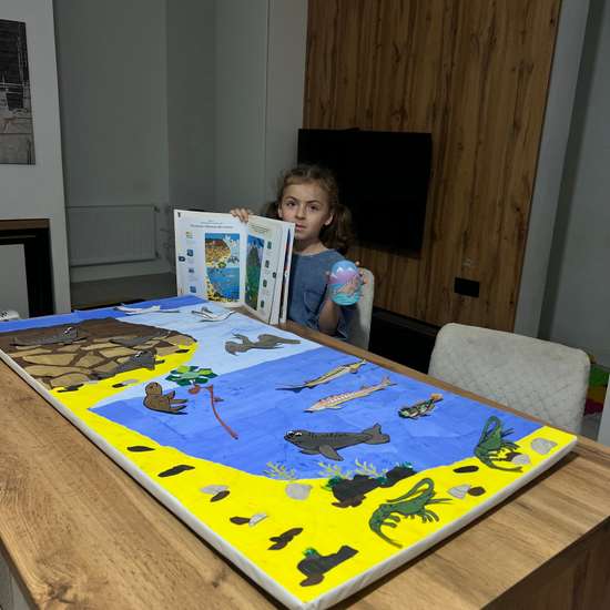 Мадина очень любит рисовать, делать поделки, узнав о конкурсе захотела участвовать. Мадина рвала, вырезала и клеила цветную бумагу. В процессе работы Мадина была так воодушевлена любые трудности возникающие в процессе работы её не останавливали, такие как вырезание цветной бумаги совсем в мелкие кусочки и обклеивание рыбок, это было очень долгая и трудная работа. Работала целую неделю.