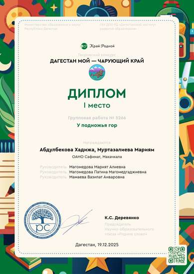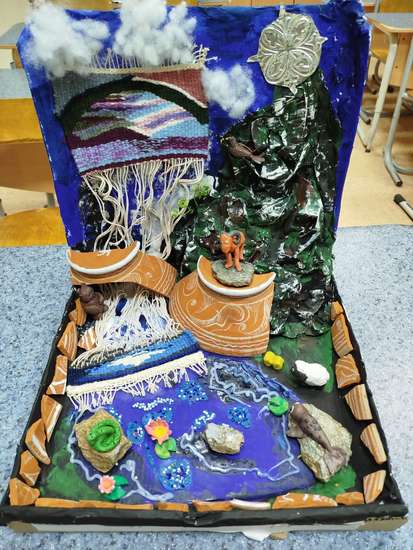 Работа выполнялась двумя ученицами, с помощью учителя. Первый этап, совместное планирование сюжета, эскиза и сбор необходимого материала, далее собрана платформа из картона (вторичная переработка). Создание объема гор и фактуры техника папье-маше, поэтапная покраска. В работе хотелось передать не только величие гор, но и показать ремесла (гончарное, ювелирное, ковроделие). Только начатый ковер с изображение арки как в селах перетекает в орнамент, как бурлящая река или водопад спадая бурлит и пениться, силу воды останавливают натуральные камни (собраны с вершин гор), на которых греется змея, морж и пришёл попить воды баран. Из разбитого керамического блюда (дарим вторую жизнь) теперь вытекает речка в которой ловит рыбу бурый мишка, на другой стороне на вершине на нас смотрит дагестанский тур, ещё выше отдыхает орёл. Светит нам серебренное солнышко, чеканка на фольге. Хотелось передать умиротворение, гармонию и красоту природы, как нам кажется у нас получилось!