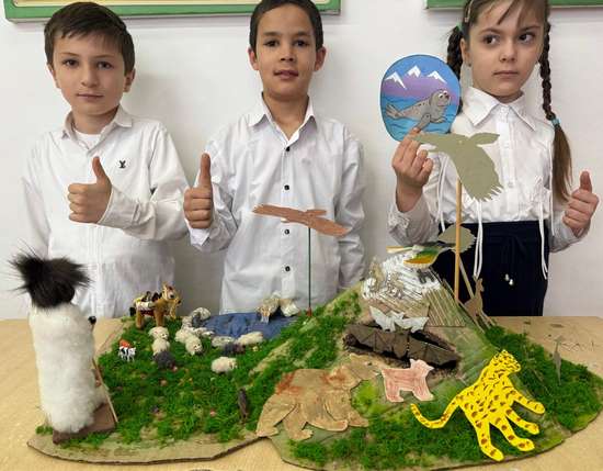 Групповая работа под руководством класс. руководителей Кушиевой Г.Г, Корбановой З.А .Ученики 3-х классов представители макет в номинации «Тайны горных вершин». Использовался материал : картон, клеевой пистолет, краски, мох, разнообразные камни, шерсть, пластилин, бумага, пластика, дерево. В этой номинации мы показываем ;животный и растительный мир обитающих на разной высоте гор ,раскрываем тайны горных минералов, пищер и их обитателей, среда обитания , взаимосвязь живой и неживой природы. Дети были крайне заинтересованы в изучении родных простор, а именно гор. Работу выполнили с любовью к родной природе