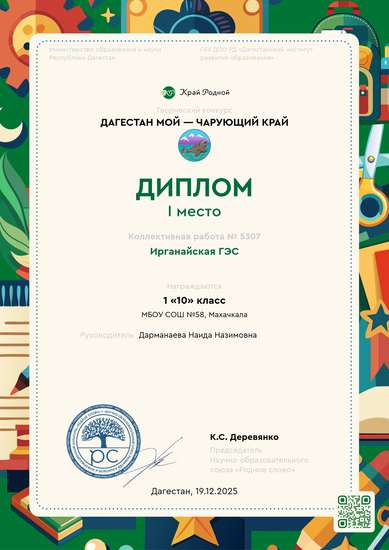 Пояснительный текст Этот макет изображает Ирганайскую гидроэлектростанцию - одно из важных и красивых мест Дагестана. В работе показаны арочная плотина, бирюзовое Ирганайское водохранилище и горное ущелье, в котором протекает река. Макет передаёт гармонию природы и инженерного мастерства, а также символизирует развитие и мощь моего родного Дагестана. Эта работа отражает величие природы и труда людей.