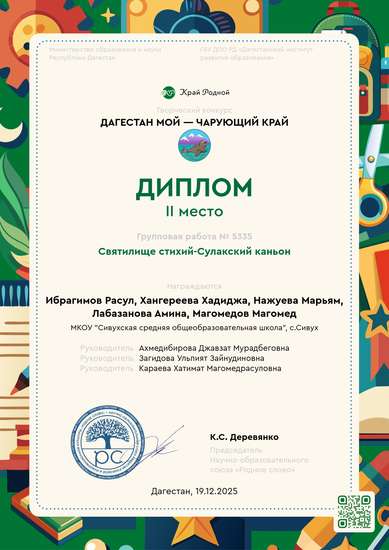 Хочу поделиться с вами идеей удивительной поделки, которая воплощает в себе всю мощь и красоту природы — "Святилище стихий" в образе величественного Сулакского каньона! Идея создания такой работы была предложена учащимися,так они не раз побывали и видели всю красоту и многообразие природных ландшафтов этой местности. Для начала работы в первую очередь понадобился твердый картон и лотки яиц,для создания выпуклости и реалистичности горных массивов.Бездну реки Сулак изобразили красками,а затем покрыли эпоксидным клеем,что создает эффект реалистичности воды .На дне реке видны рыбки из пластилины, Особый акцент сделан на персиковые сады,встречающиеся в этой местности . Крона дерева изготовлена из вторсырья-губки,а плоды-из пластилина. Учащиеся принимали непосредственное участие в создании каждого элемента поделки-в сборе и покраске основы,создании образа чабана с барашками ,работе с природным материалом .