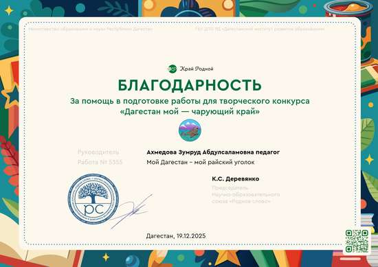 Работа выполнена самостоятельно Расуловой Сабиной, под руководством педагога. Мама Сабины оказала помощь в фотографировании процесса работы, а также в её загрузке. Данная тема очень интересна, ведь она отражает красоту и богатство нашего края, единство и дружбу народов, прививает интерес, укрепляет внимание и заботу, повышает чувство ответственности перед своей малой Родиной.