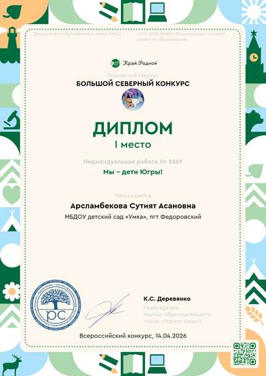 Познавательно-интеллектуальная игра «Мы - дети Югры!» проводилась в детском саду «Умка» среди воспитанников подготовительной группы. Возраст детей составил 6-7 лет, общее число участников — 21 человек. Это мероприятие систематизирует знания, полученные в результате работы с пособиями «Моя Югра. Край, в котором я живу». Цель: формирование интереса к истории нашей малой родины. В ходе мероприятия ребята смогли познакомиться с традиционными играми, с символами Югры. Узнали о коренных народах, об основных занятиях ханты и манси, об их жилищах, также о растительном и животном мире(соединяли картинки животных с их хвостами, сопоставляли следы с животными, находили их жильё). Далее настоящие маленькие сибиряки показали свою ловкость и преодолели препятствия в спортивной эстафете «Собери шишки». Закрепляли полученные в ходе игры знания, оказавшись в мини-музее, где с большим интересом рассматривали его экспонаты. В заключении мероприятия дети исполнили хантыйский танец. Ребята активно участвуя в игре, проявили интерес и любовь к родному краю, показывая, что действительно являются истинными патриотами своей маленькой Родины.