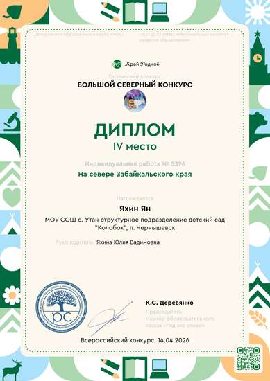 Работа представлена про народ Забайкальского Севера - Эвенков. Это уникальный народ, который бережно относится к окружающей среде, ведёт учёт природных процессов, а так же соблюдает традиции, такие например как - обожествление огня. Во время выполнения работы, я познал, что природа является частью нашей жизни, которую необходимо беречь. При помощи наблюдательности можно общаться с природой и необходимо этому приучаться с малых лет.