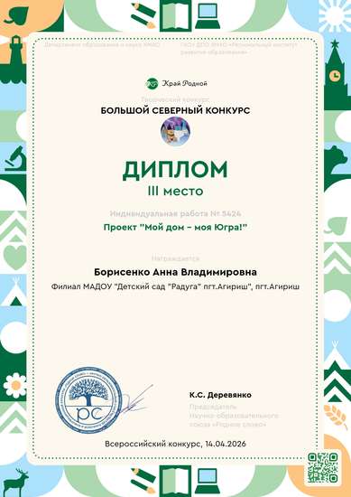 Данный проект проводился в рамках празднования 95-летия округа Югра. В мероприятии приняло участие 54 ребенка. Проект "Мой дом - моя Югра!" получил положительный эмоциональный отклик среди воспитанников, их родителей. педагогов. Родители отметили активизацию интереса детей к родному краю, а педагоги выразили удовлетворение от того, что проект способствует развитию многих навыков у воспитанников.