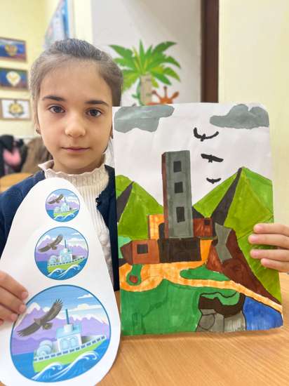 Картина нарисована ученицей 3 «2» класса Касимовой Аси. На картине изображен Дагестан , во всей своей красе горы , реки , вершины и старинные дома . А на небе летают 3 больших орла . На картина автор использовал яркие летние краски , как зеленые , синие , оранжевые и коричневые .