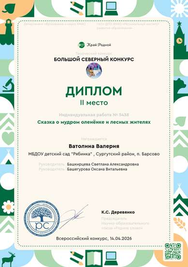 Согласно ФГОС дошкольного образования, "познавательное развитие" дошкольников предполагает формирование первичных представлений о малой родине и Отечестве, представлений о социокультурных ценностях нашего народа, об отечественных традициях и праздниках, в том числе и учёт этнокультурной ситуации развития детей. С целью решения данной задачи, в нашей группе реализуется программа "Моя Югра край, в котором я живу". В ходе ознакомления модуля "Природа", дети нашей группы были так заинтересованы, что у одной девочки возникла идея написать сказку "О мудром оленёнке и лесных жителях". С целью поддержания творческой инициативы Валерии, мы, педагоги совместно с родителями создали мультфильм по мотивам данной сказки. Наша сказка учит тому, что в природе всё взаимосвязано, и только живя в согласии, можно достичь гармонии. А мудрость не зависит от размера или силы - даже маленький олененок может научить взрослых зверей важным вещам. https://cloud.mail.ru/public/kda1/4Q6F2cV6r