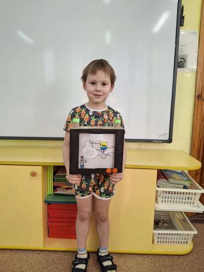 Я родился и живу в большом северном краю ЮГРА, мой город называется Сургут, находится он в Ханты-Мансийском АО. Наш город очень комфортный, в нём много интересных мест и достопримечательностей. Наша поделка как телевизор с помощью втулок крутится и показывает слайд за слайдом: историю нашего города и природные богатства(река Обь, памятники, мосты, необычные арт объекты, фонтан нефти, музей, памятник основателям Сургута). Я очень люблю и восхищаюсь своим краем. Я много трудился над своей поделкой (вырезал, клеил, раскрашивал). Родители мне помогали в сборке.