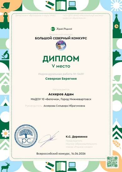 Создание поделки «Северная Берегиня» напрямую соотносится с целями и тематикой конкурса: отражает северный колорит и связь с культурой народов Русского Севера; опирается на фольклорные традиции — образ Берегини восходит к древнеславянской мифологии, где она выступала как хранительница рода и домашнего очага; воплощает народное сказование через символику оберега: каждый элемент несёт в себе скрытый смысл, напоминающий о древних поверьях и сказаниях. Связь с Севером. Легенда о Берегине органично вписывается в северный фольклор, где особенно ценились обереги от стужи и невзгод. Воспитательный потенциал. Через создание оберега ребёнок знакомится с народными ценностями: единством семьи, уважением к традициям, верой в добрые силы. Ребёнок (возраст 7лет): выбирал ткани по цвету и фактуре, ориентируясь на «северную» гамму; нарезал полоски ткани для скручивания основы; участвовал в формировании тела и головы Берегини методом наматывания; накладывал цветные лоскуты, создавая узор; завязывал нити, закрепляя слои (под присмотром взрослого); придумал имя для Берегини («Хранительница Севера») и сочинил короткую легенду о её силе.