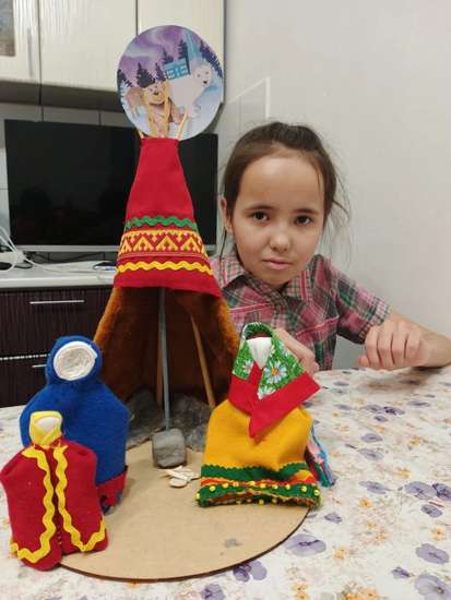 Через макет «Счастливая семья хантов» стремилась показать единство человека и природы, уважение к традициям и ценность семейных уз. Использование натуральных материалов (дерево, мех, ткань) в сочетании с яркой декоративной вышивкой (бисером) и орнаментом позволяет создать достоверный и эмоционально наполненный образ традиционного стойбища, где царит тепло, забота и счастье, достаток и красота природы вокруг.