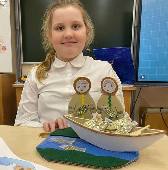Наша работа представлена в номинации "Жизнь в ритме Севера". Важную роль в ритме жизни коренных народов играет рыболовство. Рыбалка — часть многовековой культуры хантов. Эта тема близка и нам, потому что папа увлекается рыбалкой и может много рассказать об этом занятии. Папа и помог изготовить лодку для семьи рыбаков из дерева.