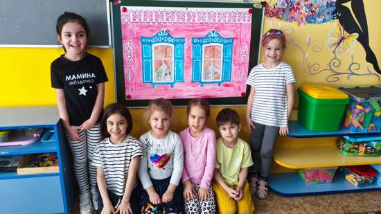 В нашем районе Москвы разобрали последнее деревянное жилое сооружение. И нам с ребятами захотелось сохранить память красивых наличников и уютных окошек простых старинных жилых домов, а не дворцов. Для отрисовки подзора (деревянное украшение под крышей дома) использовался шаблон вырезанный педагогами. Также старались за счёт не ровного нанесения гуаши передать фактуру деревянного дома.