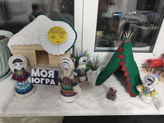 Поделка «Моя Югра» представляет собой яркий и детализированный макет, отражающий культуру и природу Ханты-Мансийского автономного округа — Югры. На переднем плане изображены две фигурки женщин в традиционных костюмах, символизирующих югорскую культуру. Их наряды украшены орнаментами, характерными для народов Севера. Рядом с ними находится деревянный домик с крышей, покрытой белым материалом, напоминающим снег. На крыше домика изображено солнце с лицом, что добавляет поделке сказочности. Справа от домика расположена зелёная палатка, украшенная красными орнаментами, символизирующая традиционное жилище народов Севера. Перед палаткой стоит фигурка человека в костюме, напоминающем национальную одежду. Рядом с палаткой находится небольшой костёр, выполненный из подручных материалов, что подчёркивает атмосферу уюта и тепла. На заднем плане видны элементы природы, такие как ветки ели, которые создают ощущение лесной тайги. Поделка выполнена из бумаги, картона, клея и других доступных материалов, что делает её доступной для создания детьми. Эта работа передаёт дух Югры, её суровую, но прекрасную природу, а также уважение к традициям и культуре народов Севера.