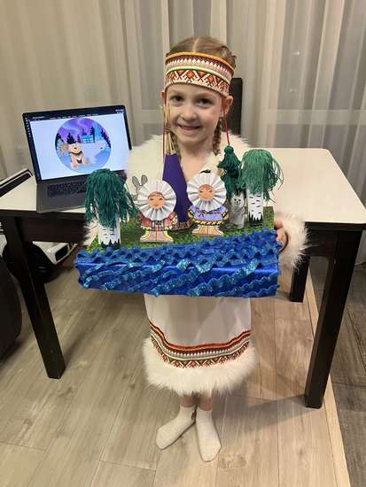 Наша поделка отражает жизнь коренных народов Севера, их тесную связь с природой и умение жить в гармонии с окружающим миром. В центре композиции изображено традиционное жилище — чум. Он символизирует дом, тепло и защиту от сурового северного климата. Рядом с жилищем мы изобразили людей в национальной одежде. Их костюмы украшены орнаментами, которые несут в себе не только красоту, но и смысл: узоры отражают природу Севера, животных, солнце и жизненный путь человека. Одежда тёплая и удобная, она помогает выживать в холодных условиях. Вокруг расположены деревья, река и животные — важная часть жизни северных народов. Жизнь на Севере подчинена смене сезонов. Люди внимательно наблюдают за природой: за движением воды, поведением животных, изменением погоды. Это помогает им выживать, планировать охоту, рыбалку и передвижение. Через нашу работу мы хотели показать, что главное — это уважение к природе и умение жить с ней в согласии. У коренных народов Севера нам стоит учиться бережному отношению к окружающему миру, внимательности к его знакам, терпению и умению ценить простые, но важные вещи.