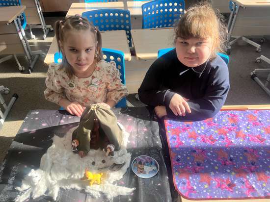 Дети с учителем старались показать жизнь в тундре, традиции и быт коренных народов Севера (оленеводство) через их единение с природой. Оленеводы учитывают сезоны и ритмы природы при ведении хозяйства, здесь и выбор маршрута кочевий. Это отражается в их одежде - малице, жилище-чуме. Из палочек для суши выполнили каркас чума, из ткани верх чума. Изнутри оборудовали и женскую и мужскую стороны чума, лежанки, подушки, печь, дрова и даже "Чумовые шаньги". изображая промысел слепили оленя и нарты, оленегонную лайку и даже белого медведя.