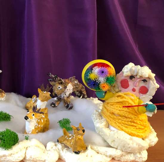 Тема магии, обрядов, легенд всегда интересна детям. Поэтому рассказ и беседы о тесной связи шамана с оленями вдохновил детей на изготовление макета. Шаман— посредник между миром людей и миром духов. Олень — объект духовного поклонения. На нашем макете, дети в разных техниках слепили стадо оленей, использовали в лепке вату и глину. Олени получились реалистичными. Многие народы севера верят, что олени обладают особой магической силой, и проводят ритуалы, связанные с их жизнью. Наш шаман с бубном созывает духов на здоровье оленей, на ягель для корма. Считается, что шаманы наделены сверхъестественными способностями : могут предсказывать будущее, вселяться в животных и людей, исцелять больных, совершать поиск пропавшего стада оленей, предотвратить череду неудач в охоте. Главный ритуал в практике шаманов — камлание — способ взаимодействия с духами и божествами, сопровождаемый ритмичными ударами бубна и песнопениями. Бубен для шамана – это живое существо. Во время камлания шаман поёт, танцует, бьёт в бубен колотушкой, призывает духов помощников. А Северное сияния на заднем плане макета подчеркнуло белизну снега Крайнего Севера, а так же красоту благородных животных- оленей.