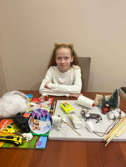 Материалы и инструменты: кусок пеноплекса; цветной фетр (плотный для основы); пластилин; краски; воздушный шар; нить лавсановая; клей ПВА, клеевой пистолет; ножницы; салфетка из микрофибры, канцелярский нож (под присмотром взрослых); карандаш; деревянные палочки (для остова юрты); сухие блестки; синтепон фигурки. Этап 1: надуваем воздушный шар и обматываем его пропитанной клеем ПВА лавсановой нитью. Размешиваем сухие блестки с оставшимся клеем ПВА и покрываем им получившуюся сферу. Оставляем просохнуть на 24 часа. Этап 2: изготовление чума. Вырезаем круг из плотного фетра. Сначала делаем опорные жерди, для этого связываем узлом в верхней части 3 палочки. На круглой основе чума по краю расположим 6 шариков пластилина на равном расстоянии. Вставляем палочки, еще раз обвязываем ниткой и декоративной проволокой. Оборачиваем чум салфеткой из микрофибры, оставляем вход открытым. Этап 3: иголкой протыкаем сферу из ниток и лопаем шарик, вытаскиваем его. С помощью родителей ножницами делаем большое отверстие. Этап 4: в пеноплексе вырезаем лунку (для зимней рыбалки) и красим ее в синий цвет. Лепим из пластилина рыбу. Из палочки и нитки делаем удочку. Этап 5: сборка композиции.