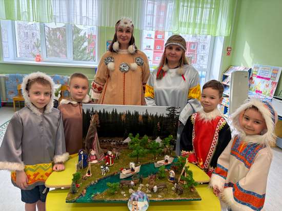 Работа «Дыхание тайги» знакомит детей с природой и животным миром северных регионов, бытом коренных народов ханты и манси, раскрывает связь человека и природы. Тема приобщает к этнокультурному наследию, формирует экологическое сознание и познавательный интерес через образы чумов, оленей, охотников, рыболовов и диких животных. Замысел композиции — создать миниатюрный мир сибирской тайги, где сосуществуют люди и животные. В макете: чум, фигурки охотников и рыболовов в национальной одежде, северные олени, деревья, река. Дети под руководством взрослых лепят детали из пластилина, создают деревья из веток и мха, украшают фигурки орнаментами, размещают элементы на основе, декорируют чум. Воспитатели готовят основу из фанеры, изготавливают крупные элементы, вырезают заготовки, помогают в сборке и обучают работе с материалами. Макет становится «окном в мир тайги», позволяя ощутить её дыхание и проникнуться красотой северной природы.