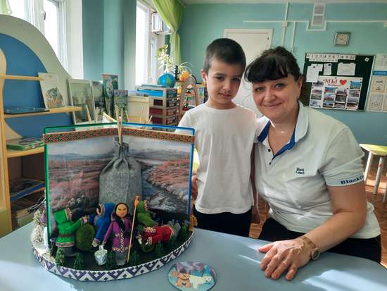 Для участия в номинации «Мудрый мир народного сказания» мы остановили свой выбор на ненецкой сказке «Кукушка» — древней легенде, в которой заключена вековая мудрость наших предков. Эта легенда, передаваемая из поколения в поколение, учит нас важнейшей истине: родительская любовь — бесценный дар, который нужно беречь. По этой сказке мы создали композицию, как художественную интерпретацию фольклорного текста. В работе мы стремились раскрыть многоуровневый символизм сюжета: образ матери‑кукушки; бегущие дети; пространство композиции выстроено как путь от домашнего очага к открытому небу, подчёркивая необратимость выбора. Мы выбрали этот сюжет, потому что он трогает до глубины души и остаётся актуальным во все времена.